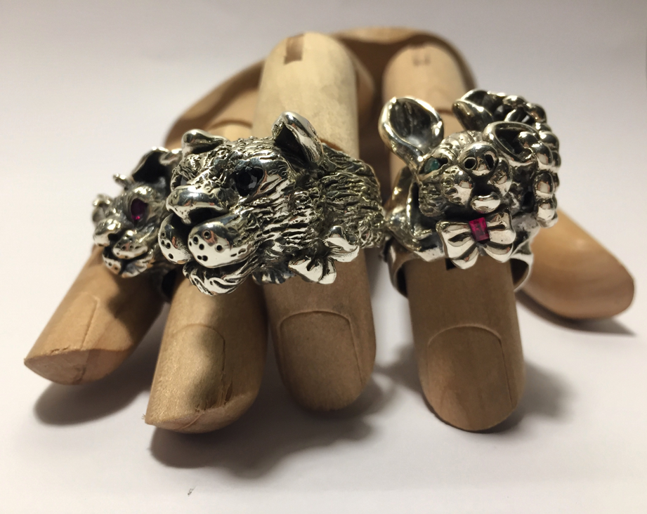 In this series of silver rings with rubies, sapphires and emeralds, rabbits, rats, cats, panthers and
